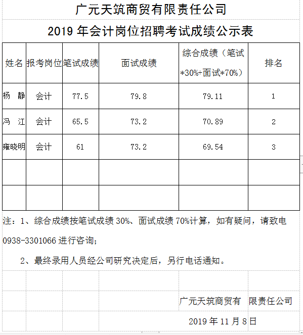 廣元天筑商貿有限責任公司2019年會計崗位招聘考試成績公示表